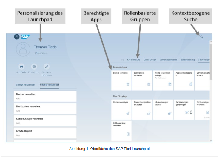 SAP Fiori Apps werden über das SAP Fiori Launchpad aufgerufen. Die Anmeldung des Benutzers erfolgt direkt über das Launchpad. Auf dem Launchpad werden den Benutzern die ihnen zugeteilten Apps als Kacheln dargestellt. Abbildung 1 zeigt die Oberfläche des Launchpad. Im linken Bereich hat der Benutzer die Möglichkeit, das Launchpad individuell für sich zu gestalten. So kann z.B. das Layout und die App-Anordnung geändert werden.