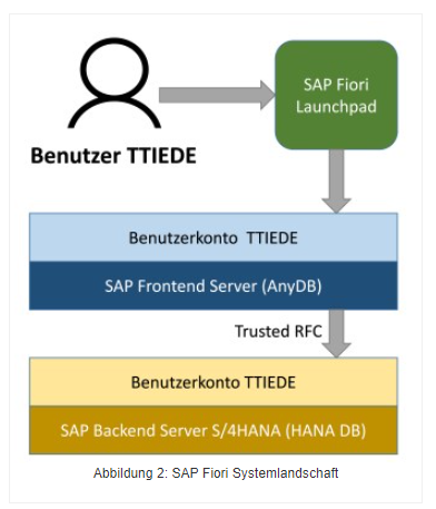 In Abbildung 3 bedeutet dies: vom SAP Fiori Frontend können Aktionen im S/4HANA Backend ausgeführt werden ohne explizite Anmeldung (notwendige Berechtigungen vorausgesetzt).