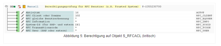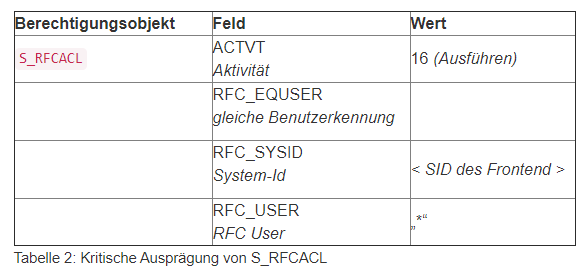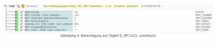 Bei der Berechtigung in Abbildung 5 kann der Benutzer, dem diese Berechtigung im Backend zugeordnet ist, grundsätzlich durch jeden Benutzer aus dem Frontend (IE1) genutzt werden, wodurch diese Berechtigung als äußerst kritisch einzustufen ist. Wenn eine kritische Berechtigung dieser Art vorliegt, so könnte im Backend eine RFC-Verbindung definiert werden, in welcher z.B. der Benutzername TOMTIEDE fest hinterlegt wird. Somit könnte jeder Benutzer im Frontend, der diese RFC-Verbindung nutzen kann, unter der Benutzerkennung TOMTIEDE im Backend arbeiten, somit also anonym. Die Berechtigungen auf dem Objekt S_RFCACL