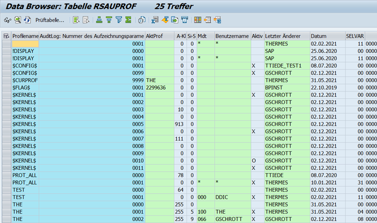 Datensätze, deren Einträge im Feld PROFILNAME nicht mit den Zeichen $ oder ! beginnen, definieren die Einstellungen der statischen Filter. Hier lassen sich zumindest ohne aufwändige Analysen die hinterlegten Mandanten, Benutzer und die Aktivierung des Filters entnehmen. Das aktuelle Profil wird über den Profilnamen $CURPROF vorgegeben.