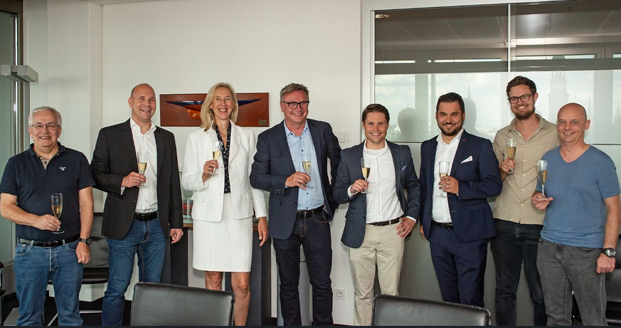 Vertreter des Ebner Stolz GBIT-Teams mit Marcus Herold (Erster von links), Sebastian Schreiber (Vierter von rechts), sowie Johannes Schwarzenberger und Ingo Wihl (rechts außen) nach der Vertragsunterzeichnung bei IBS Schreiber