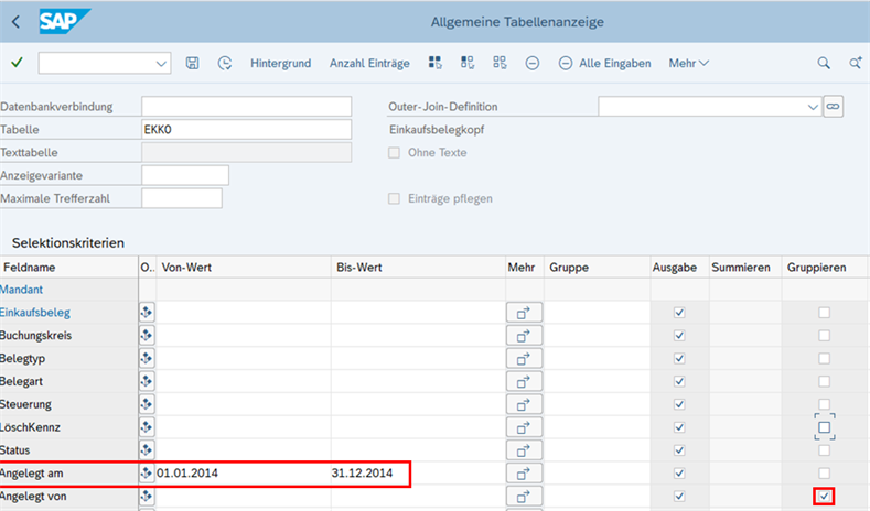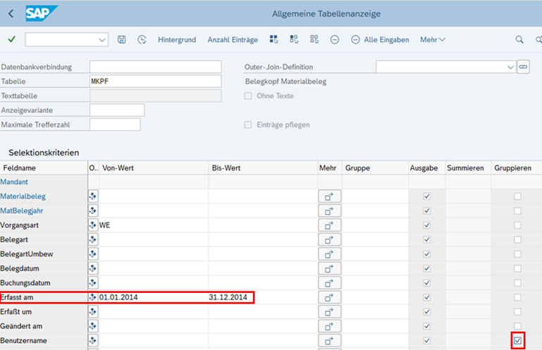 Im folgenden Beispiel wird der genannte Funktionstrennungskonflikt (Bestellung, Wareneingang und Rechnung) im ERP-System SAP nachgestellt. Für die Tabellenauswertungen wird die Transaktion SE16H verwendet, da in dieser Transaktion die Gruppierung nach Benutzername möglich ist. Nach Auswertung der einzelnen Tabellen werden diese im Excel gesichert.