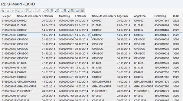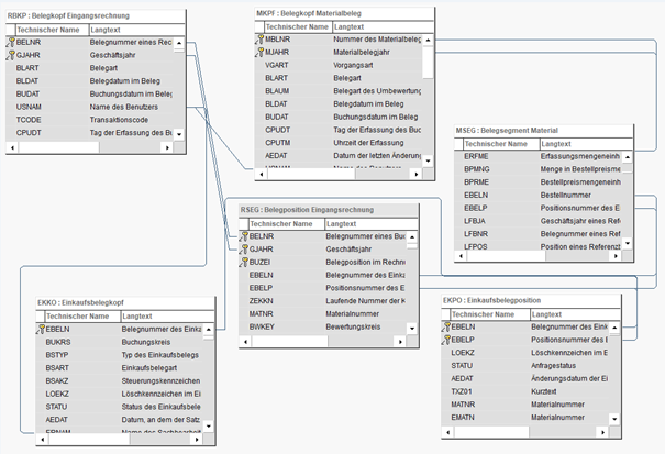 Die Analyse wurde im SAP mit der Transaktion SQVI vorgenommen. Dafür wurden zusätzlich zu den drei Kopftabellen (EKKO, MKPF und RBKP) auch die drei Positionstabellen (EKPO, MSEG und RSEG) benötigt.