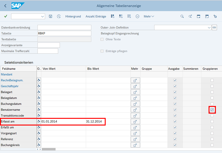 Nach Erstellung der Verlinkungen werden die Selektions- und Ausgabefelder ausgewählt. Hier sollten in den jeweiligen Header-Tabellen (EKKO, MKPF und RBKP) jeweils die Belegnummer, der Username, ggfs. der Buchungskreis und das Ausführungsdatum der Transaktion (nicht das Beleg- oder Buchungsdatum) ausgewählt werden.