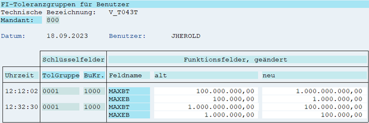 Erhält man bei dieser Auswertung einen Treffer, sollte zunächst geprüft werden, ob der Benutzer zum Buchungszeitpunkt bereits der Toleranzgruppe zugeordnet war. Dies kann anhand des Änderungsprotokolls für Tabelle T043 ermittelt werden. Bestand die Gruppenzuordnung bereits zum Buchungszeitpunkt, ist dies ein Hinweis darauf, dass die Betragsgrenzen der Toleranzgruppe angepasst worden sein müssen. Mit Hilfe des Änderungsprotokolls für Tabelle T043T kann festgestellt werden, wer wann welche Änderungen an den Betragsgrenzen vorgenommen hat.