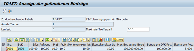 Anschließend kann mit Hilfe der Tabelle T043T festgestellt werden, welche Betragsgrenzen in dieser Toleranzgruppe definiert wurden.