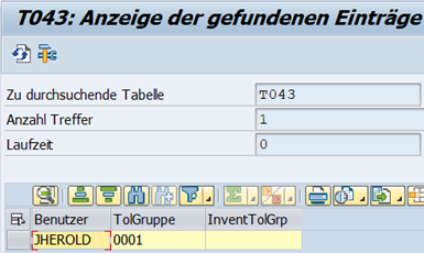 Mit Hilfe von Tabellenauswertungen kann festgestellt werden, ob ein Benutzer in der Vergangenheit Buchungen durchgeführt hat, deren Betrag oberhalb des ihm zugewiesenen Grenzbetrags liegt. Um dies zu prüfen, muss im ersten Schritt die Toleranzgruppe des Benutzers über die Tabelle T043 ermittelt werden.