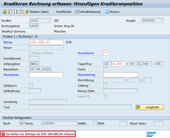 - bis zu welchem Betrag ein Mitarbeiter eine Belegposition auf ein Debitoren- oder Kreditorenkonto erfassen darf