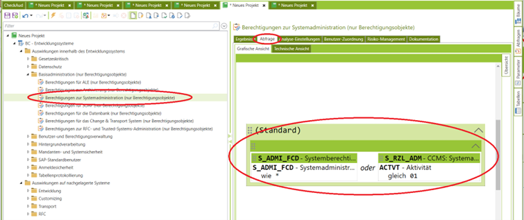 Ein weiteres Risiko besteht in unautorisierten Aktivitäten in der Basisadministration, wodurch beispielsweise die Systemverfügbarkeit gefährdet werden könnte. Oftmals werden in Entwicklungssystemen die Berechtigungen für alle Anwender über eine Rolle mit einer Vollberechtigung aufgebaut, aus der lediglich die kritischen Berechtigungen entfernt und für ausgewählte Anwendergruppen in separaten Rollen zugeordnet werden. Die startbaren Anwendungen (Transaktionen etc.) werden hier sehr großzügig bis vollumfänglich vergeben. Somit gibt es für die Anwender also viele Zugriffmöglichkeiten. Daher bietet es sich an, z. B. im Umfeld der Basisadministration nur auf die kritischen Berechtigungsobjekte ohne zugehörige Transaktionsberechtigung zu prüfen.