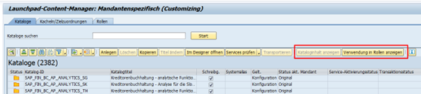 Die Inhalte des unteren Bereichs können ausgewählt werden. Entweder kann man sich die Inhalte des Katalogs oder die Verwendung in Rollen anzeigen lassen. Diese Option ist, wie in Abbildung 1: Reiter „Kataloge“ – oberer Bereich gezeigt, wählbar und kann jederzeit auch umgeschaltet werden.