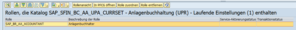 Wählt man die Anzeige der Verwendung in Rollen, so erhält man eine Auflistung sämtlicher Rollen, in welchen der ausgewählte Katalog enthalten ist. Sofern die Berechtigungen hierfür vorliegen, kann auch direkt in die Anzeige der Rolle in der Transaktion PFCG abgesprungen werden.