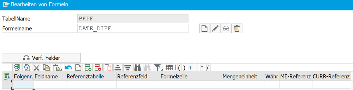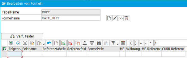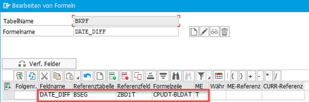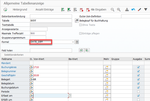 Hierzu legt man in der SE16H für die Tabelle BKPF mit Hilfe des Formeleditors eine neue Formel mit dem Namen „DATE_DIFF“ an.