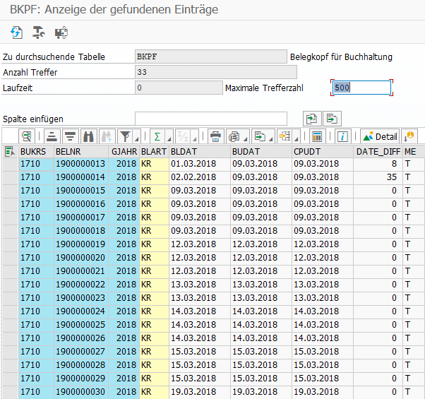 Für die Belegart KR (Kreditorenrechnungen) ist das Belegdatum i.d.R. das Rechnungsdatum. Durch Berechnung der Differenz zwischen CPUDT und BLDAT kann nun ermittelt werden, wie zeitnah eine Buchung einer Rechnung erfolgt.